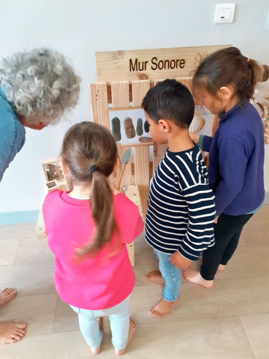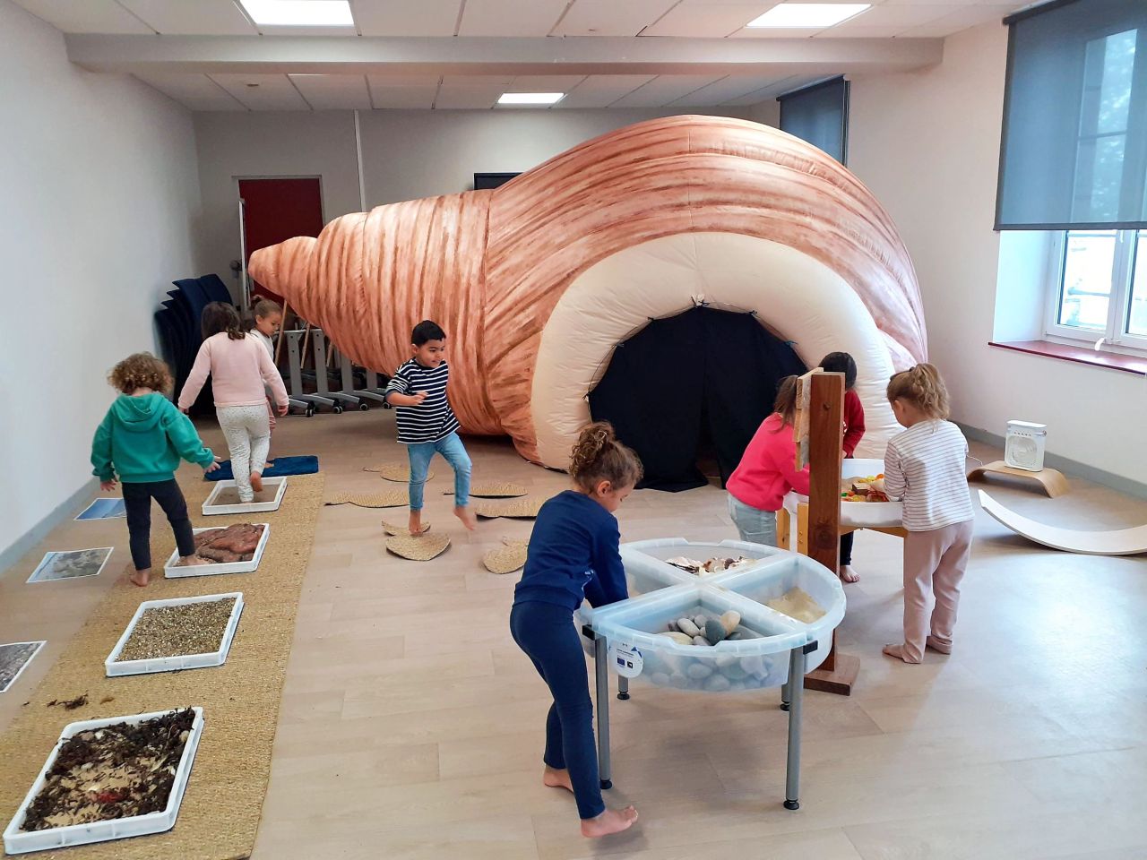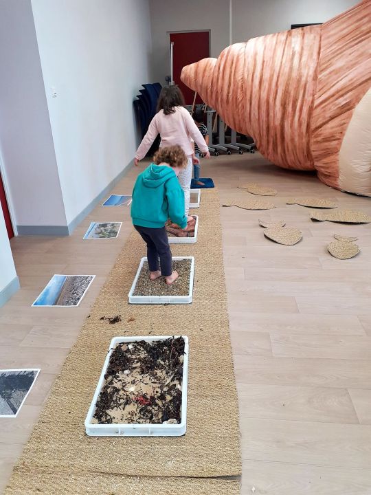 Ils ont pu marcher dans différentes matières, faire de la musique avec des coquillages et des seaux, rentrer dans un bulot géant!